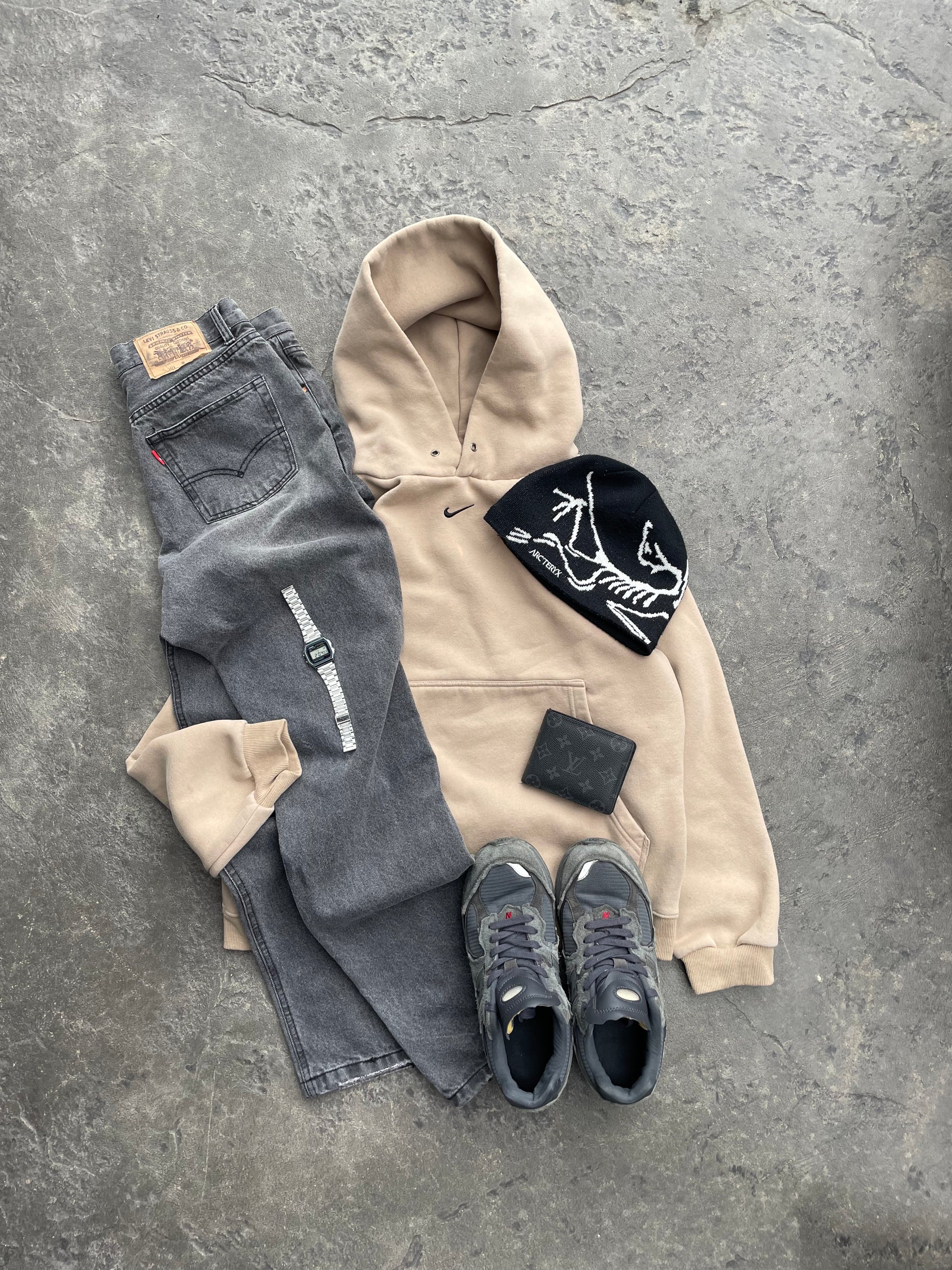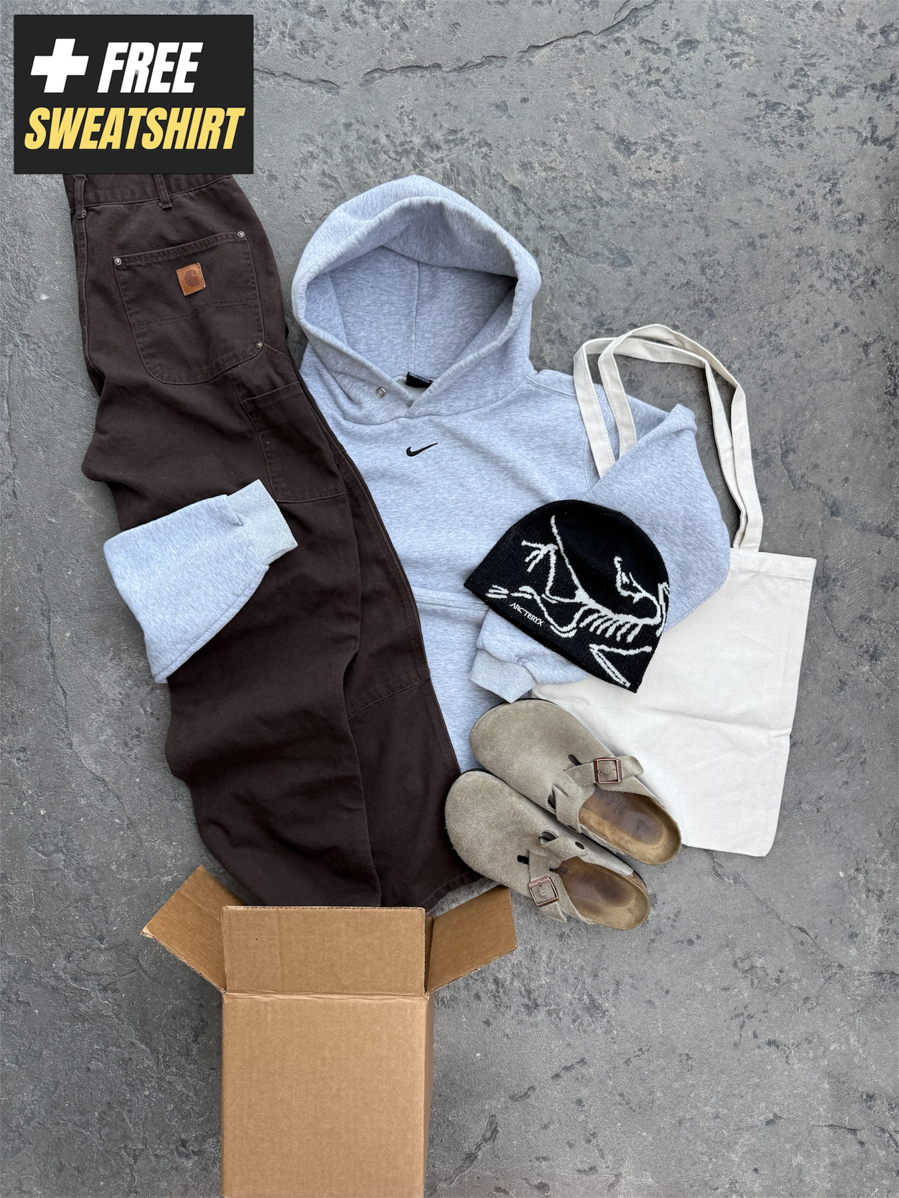 Each outfit includes a mystery vintage streetwear hoodie or sweatshirt paired with pants from one of the following brands: Carhartt, Dickies, Levi’s, RealTree, or Arcteryx